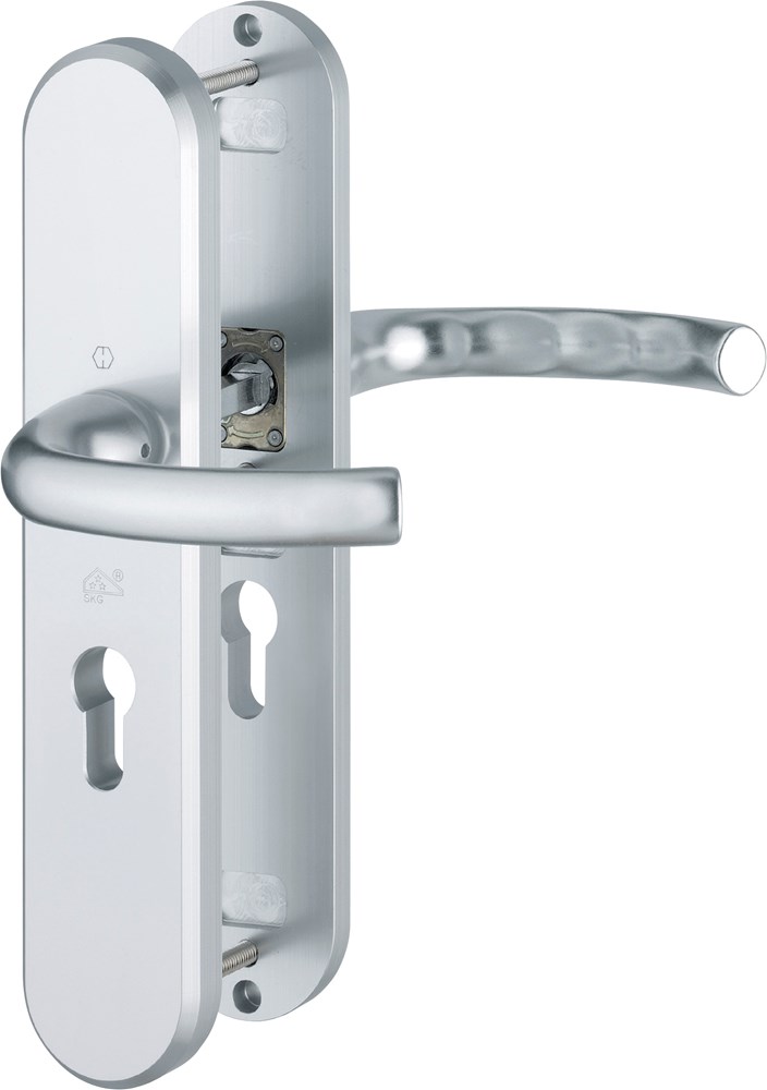 Aluminium afgerond inbraakwerend deurkrukgarnituur van massief aluminium, met rondom facet, conform NEN 5089, SKG®***-keurmerk. Buitenzijde met deurkruk met HOPPE-snelstiftverbinding en stalen nokken. Binnenzijde voorzien van hooghoudveer en met zichtbare bevestiging met 3 x M6 kruiskop Bouten en deurkruk-gatdeel.