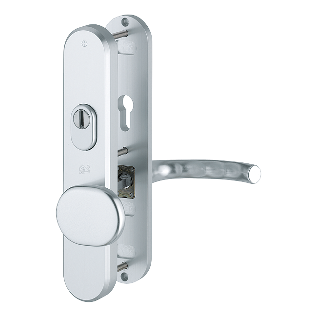 Aluminium afgerond inbraakwerend voordeurgarnituur van massief aluminium voor comfortsloten, met rondom facet, conform DIN 18257 en NEN 5089, SKG®***-keurmerk. Buitenzijde met cilinder-kerntrekbeveiliging, verkropte vaste knop, met HOPPE-snelstiftverbinding (met HOPPE-FDW-volstift) en stalen nokken. Binnenzijde voorzien van hooghoudveer en met zichtbare bevestiging met 3 x M6 kruiskop Bouten en deurkruk-gatdeel.