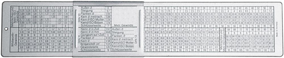 Met tabellen aan voor- en achterzijde voor metrisch normaal ISO-draad (DIN 1502, oude DIN 13), Whitworth-draad (DIN 11), Whitworth-gasdraad (DIN 259)