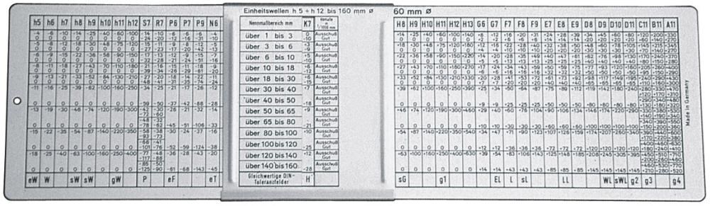 Met tabellen aan voor- en achterzijde voor eenheidsgaten H6 tot H13 volgens DIN 7154 van 1–160 mm Ø en voor eenheidsassen h5 tot h12 volgens DIN 7155 van 1–160 mm Ø