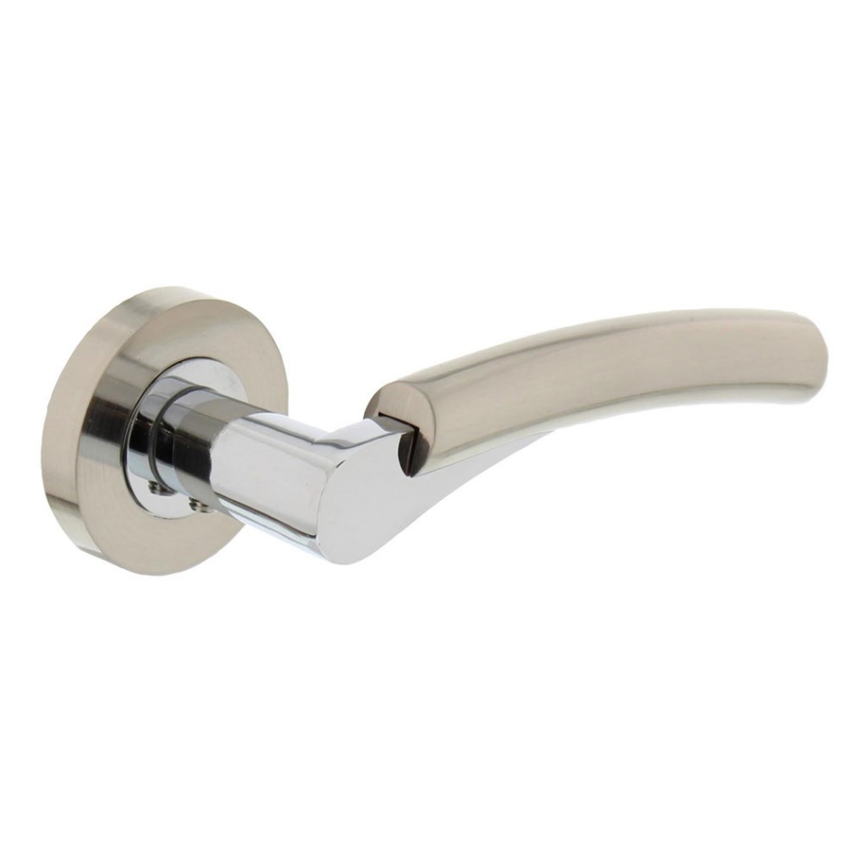 Deurkruk Bryan op rond rozet heeft een bijzondere kleurencombinatie en is uitgevoerd in mat nikkel en glanzend chroom. Deze deurkruk wordt per paar geleverd en het rozet is voorzien van nokken, waardoor de deurkruk beter op zijn plek wordt gehouden.