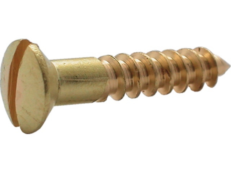 Messing, bolverzonken (lens-)kop met zaagsnede. Volgens DIN 95.
