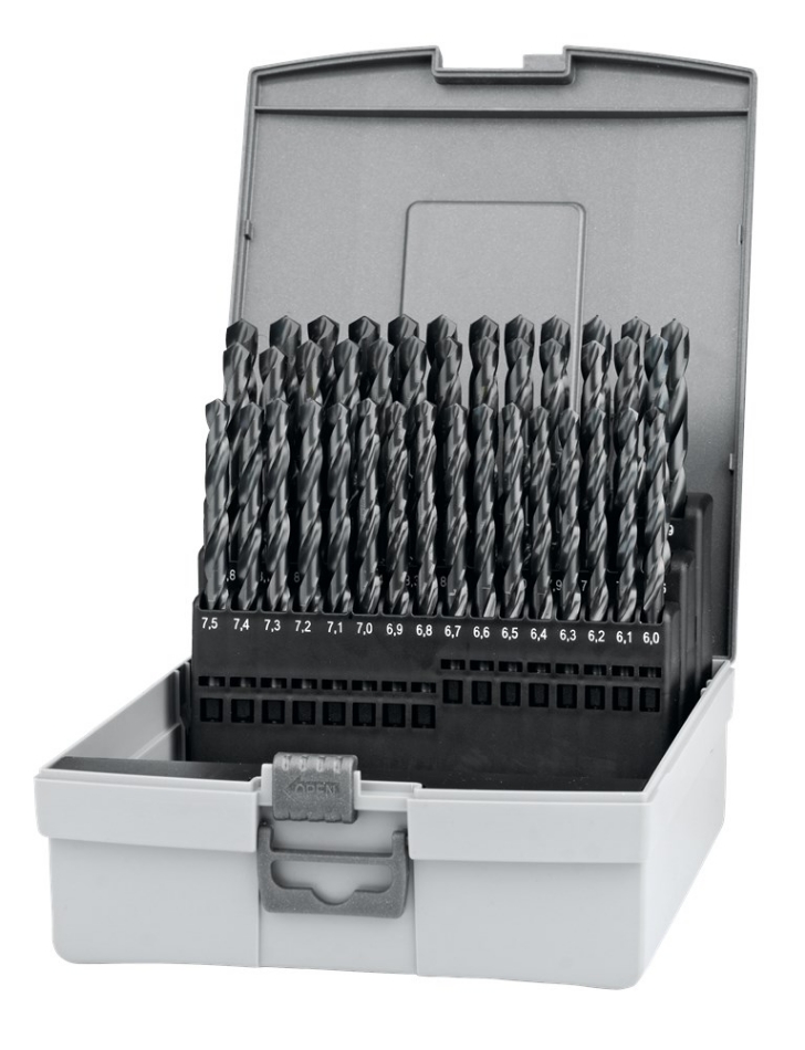 DIN 338, geslepen uitvoering, met kruisaanslijping, in kunststof cassette, gevuld met boren uit artikelgroep 11.450
