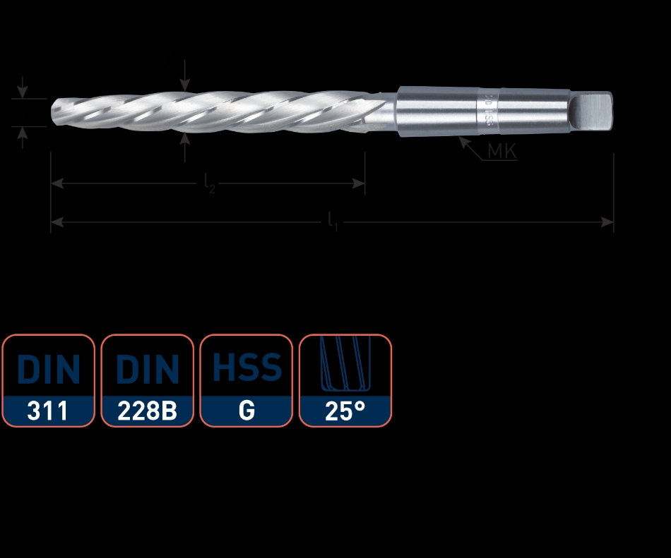 HSS klinknagelgatruimer DIN 311 met morsekonus schacht, linkse spiraalgroeven, rechtssnijdend.