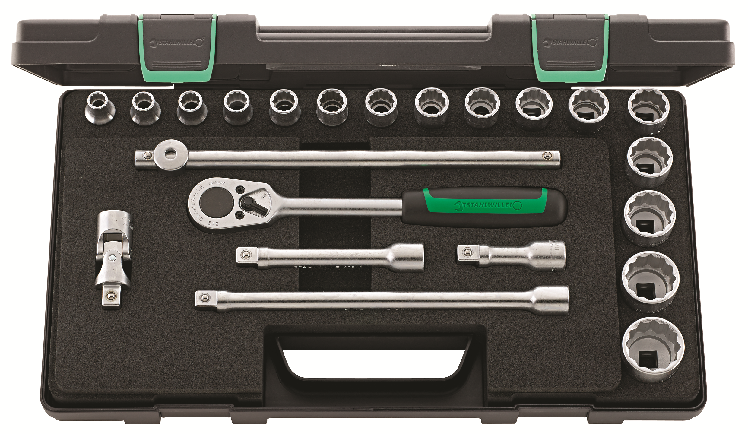 In kunststoffen doos, 22-delig, inhoud: 16 doppen, twaalfkant nr. 50: 10; 11; 12; 13; 14; 15; 16; 17; 18; 19; 21; 22; 24; 27; 30; 32 mm; 1 ratel nr. 512; 3 verlengstukken nr. 509/3 (75 mm), nr. 509/5 (130 mm), nr. 509/10 (255 mm); 1 hendel met schuifstuk nr. 506; 1 cardangewricht nr. 510.