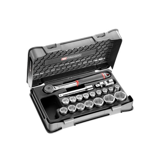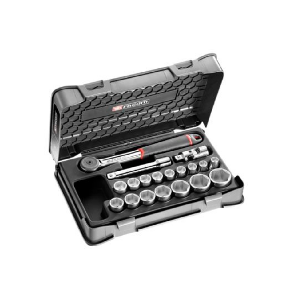 Bevat: 1 handpalm ratel, 16 doppen 1/2" 6- kant. Metrisch: S.H 10-11-12-13-14-15-16-17-18-19-21-22-24-27-30-32mm. 1 verlengstuk 1/2" 130 mm. 1 cardangewricht 1/2"