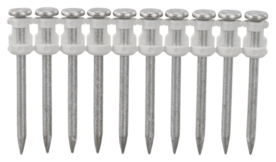 Betonnagels voor het bevestigen van metal stud en hout op beton voorzien van gegalvaniseerde coating. 1 gaspatroon meegeleverd. 10 nagels per strip. Het is ook mogelijk om de nagels op staal te bevestigen . Aanbevolen penetratie diepte per betonklasse: C16/20 25-28 mm C20/25 20-22 mm C25/30 15-20 mm C30/37 15-18 mm Aanbevolen penetratie diepte per staalsterkte: 350 N/mm2 6,5 mm Prijzen zijn aan verandering onderhevig.