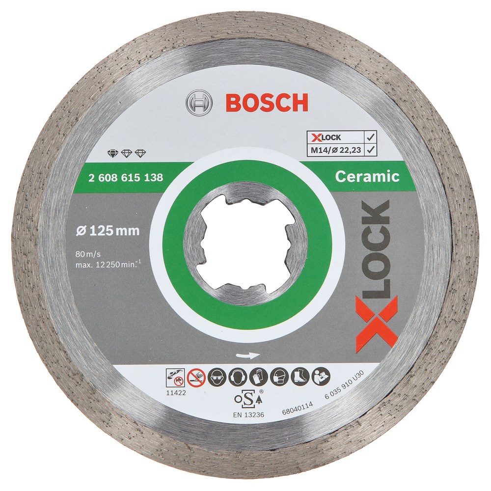 De X-LOCK Standard for Ceramic diamantdoorslijpschijf slijpt betrouwbaar tegels door. De ononderbroken snijrand zorgt voor nauwkeurige resultaten in alle soorten tegels. De hoge kwaliteitsnormen van de schijf worden bovendien gegarandeerd door het Bosch Competence Center voor diamant in Zwitserland. Gebruik deze schijf voor het doorslijpen van keramiek, porselein en fijn steengoed. Gereedschapsloos X-LOCK systeem om doorslijpschijven snel en gemakkelijk te wisselen. X-LOCK doorslijpschijven passen ook op standaard haakse slijpers.