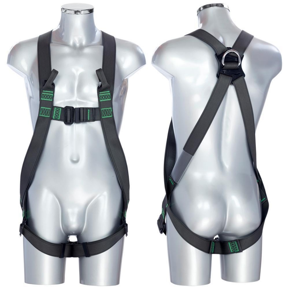 1 d-ring op de rugzijde 2 lussen op de borst. Met snel-sluit-gespen.