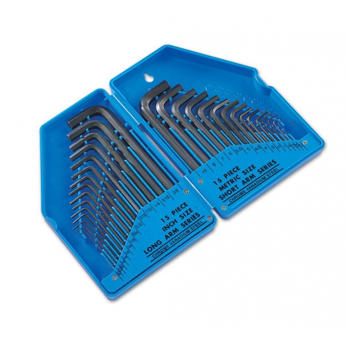 Inch maten met lange sleutels: Inbus 0.028 - 0.035 - 0.05 - 11/16 - 5/64 - 3/32 - 7/64 - 1/8 - 9/64 - 5/32 - 3/16 - 7/32 - 1/4 - 5/16 - 3/8.