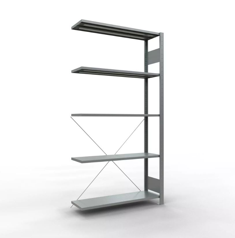 Incl. 5 MULTIplus150 legbordenLegborden zijn in een 25mm-raster in hoogte verstelbaarenkelzijdig te gebruiken, stabilisering met kruisschorenhandzaam verpakt in karton150 KG draagvermogen per plankTotale draagvermogen met stelling 1300 KG