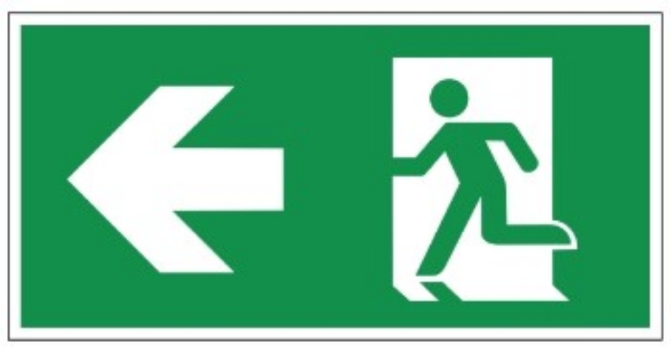 Dit nooduitgang bord laat zien dat de nooduitgang kan worden gevonden wanneer men naar links loopt. Op die manier zorgt u ervoor dat mensen in een noodsituatie precies weten waar de nooduitgang is.