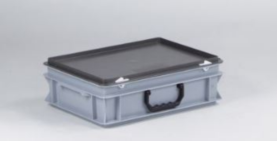 Gesloten bodem en wanden, scharnierdeksel (donkergrijs), met snapsluitingen en scharnierverstevigingen, met lichte Kunststof koffergreep op 1 lange zijde