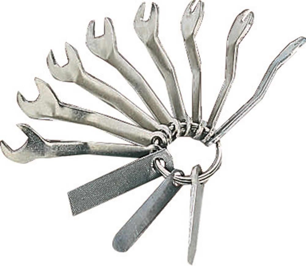 11-delige magneetsleutelset aan ring. Uitvoering: Vernikkeld. Materiaal: SPECIAAL PLAATSTAAL. Inhoud: nr. 3280 M: 4 4,5 5 5,5 6 6,5 7 7,5 mm. 1 contactvijl nr. 3280/1, 1 voelermaat nr. 3280/2, 1 schroevendraaier nr. 3280/4