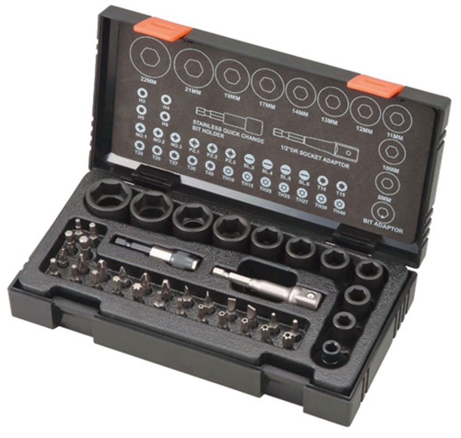 41-delige doppen en bitset voor slagmachines bestaande uit: PH 1, 2, 3 / PZ 1, 2, 3 / T 10, 15, 20, 25, 27, 30, 40 / TX 10, 15, 20, 25, 27, 30, 40 / Zeskant 3, 4, 5, 6 / Gleuf 3, 4, 5, 6 / Magnetische bithouder met snelwisselsysteem / Krachtdop 8, 10, 11, 12, 13, 14, 17, 19, 21, 22 mm / Adapter 1/4" zeskant naar 1/2" vierkant / Adapter 1/2" vierkant binnen naar 1/4" zeskant buiten
