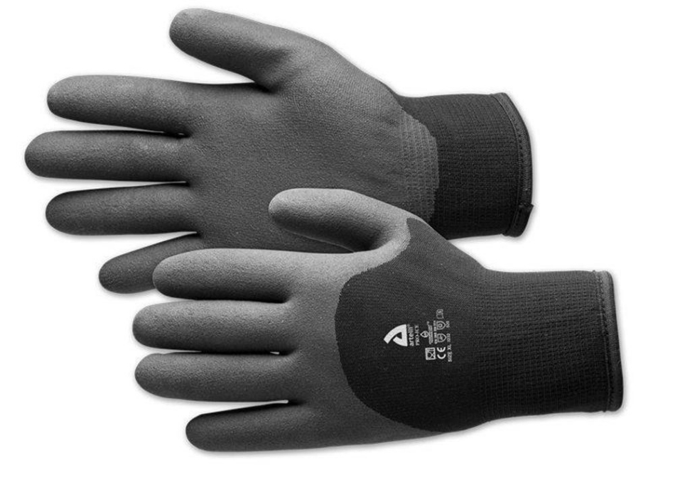 Naadloze zwarte nylon handschoen met een zwarte waterafstotende 'foam' PVC / HPT coating.