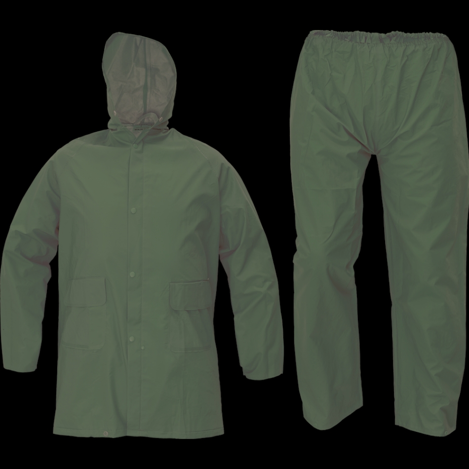 Tweedelig, beschermend pak met capuchon; 3/4 overjas met een capuchon in de kraag; broek met taille van elastisch rubber; getapete naden; PVC-coating; 2 voorzakken met klep; mouwzomen drukknoop aanpassing; onderarm en achterkant ventilatie.