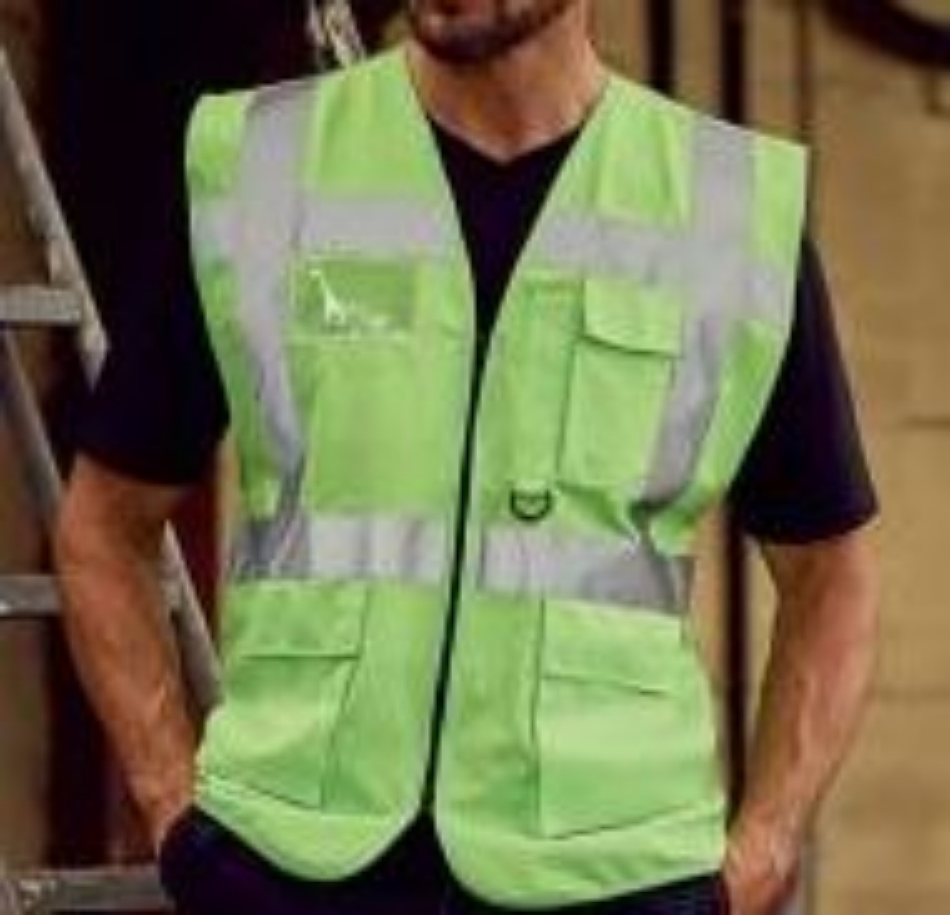 5 cm brede reflecterende banden rond het lichaam en één over elke schouder. Zak voor mobiele telefoon/walkietalkie links op de borst. Doorlopende ritssluiting vooraan. Twee bodemzakken met kleppen en toegankelijk vanaf bovenkant en zijkant. Pennenzakken en sleutelhouder. ID-zakje op rechterborst. Groot oppervlak op achterkant voor decoratie. De fabrikant garandeert de reflecterende eigenschappen volgens de EN-norm voor 25 wasbeurten!