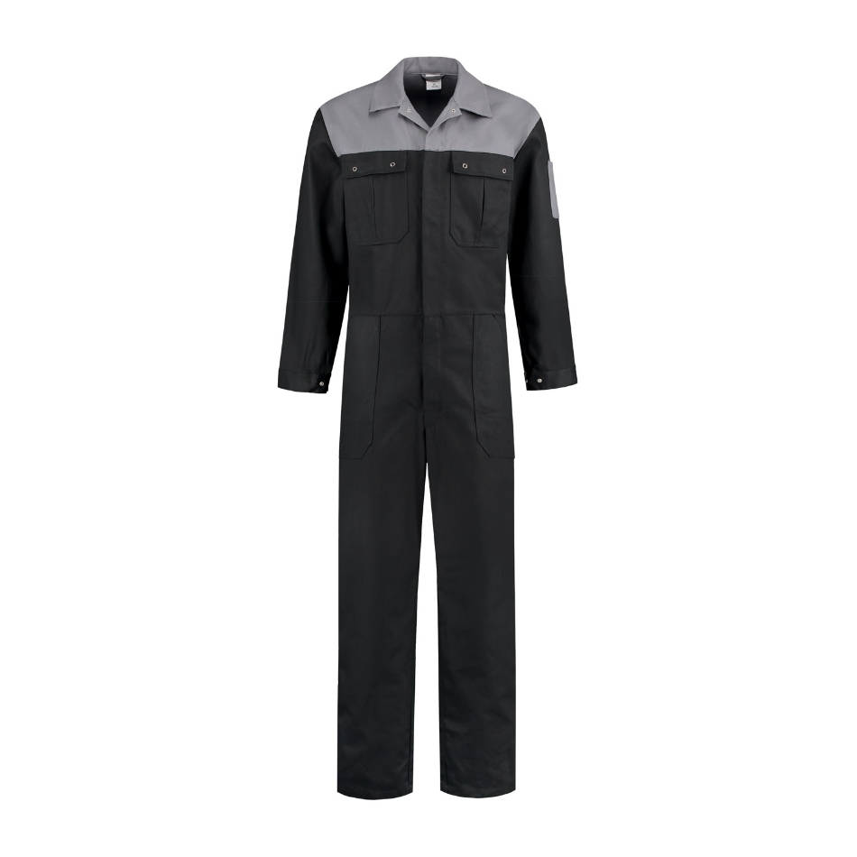 Overall 100% katoen 2-kleurig, 300 gram/m2, verdekte drukknoopsluiting, verstelbaar elastiek in de taille, rugplooien, 2 borstzakken met klep, 2 zijzakken, 2 intasten, achterzak en duimstokzak.