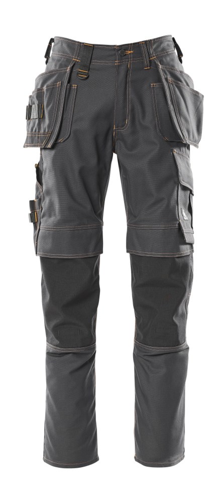 Twee- en drievoudig gestikt bij de broekspijpen en het kruis. Lage taille en voorgevormde tailleband. Ergonomisch gevormde broekspijpen. Riemlussen. D-ring. Gulp met rits. Gereedschapslus aan beide zijden van de tailleband. Spijkerzakken met versterkingen, extra zakken en lussen voor gereedschap. Openingen voor het wegsteken van de spijkerzakken. Voorzakken. Achterzakken met versterking, klep en klittenbandsluiting. Verstelbare hamerlussen. Dijbeenzak met telefoonzak en klep met klittenbandsluiting. Duimstokzak met CORDURA® versterkt en met klein zakje aan de buitenzijde. Pennenzakje. Knopen ter bevestiging van een mes. Verstelbare kniezakken van duurzaam CORDURA® (500 D) met klep en opening aan de bovenzijde. Oranje contraststiksels. Reflectie-effecten. We raden de 00418-100, 00718-100, 50451-916 en 20118-915 kniebeschermers aan voor dit model. Gecertificeerd in combinatie met kniebeschermertype SHORT of LONG in overeenstemming met EN 14404.