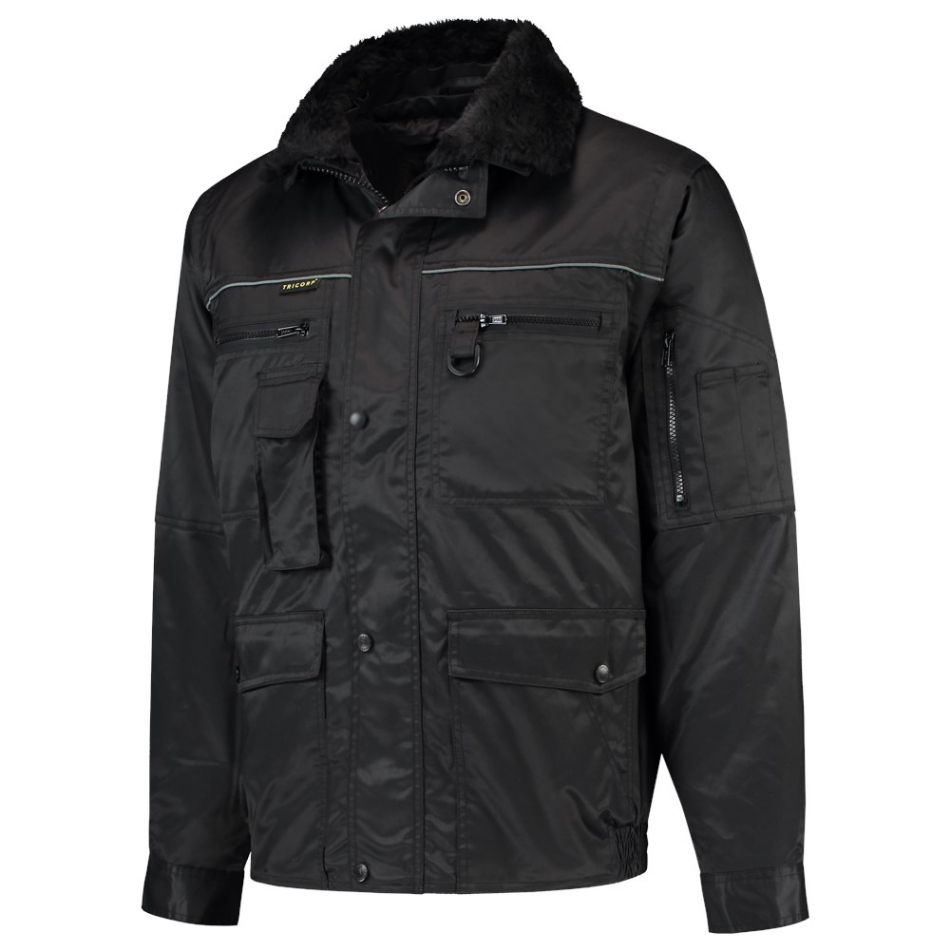 Deze pilotenjas met uitneembare fake fur voering is vuil- en waterafstotend door de aangebrachte coating. De mouwen zijn afritsbaar. Aan de voor- en achterkant zijn reflectiestrips toegevoegd voor extra zichtbaarheid. Verder heeft het jack in totaal zeven zakken: twee afsluitbare borstzakken waarvan één telefoonzak, twee steekzakken en afsluitbare klepzakken in de zij en een afsluitbare zak met twee pennenzakken.