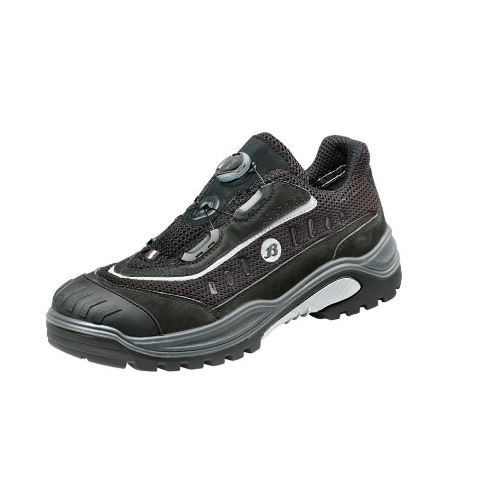 Deze veiligheidsschoen heeft een stalen neus wat de voet beschermt tegen zwaar vallende voorwerpen.