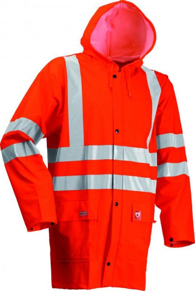 Microflex Vlamvertragende Hi-Vis regenjas. Extra zware kwaliteit. Hoog frequent gelaste naden. Vaste capuchon met koord. Rits onder stormflap met drukknoopsluiting. Mouwen met verstelbare drukknoopsluiting. Twee rechte zakken. Reflectie. Vlamvertragend/ antistatisch. 50% polyester/25% polyurethaan, 25% PVC, 340 g/m². EN ISO 14116 index 1, EN1149-5, EN343.