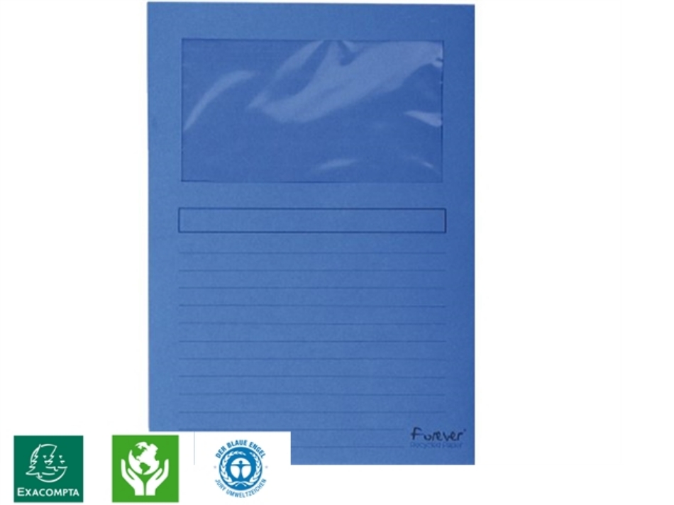 Forever L-map van 120gr gerecycled papier. Blauwe Engel gecertificeerd. Voorzijde voorzien van een transparant venster 180x100mm. De map is beschrijfbaar. A4-formaat. Afmetingen 220x310mm. Pak à 100 stuks.