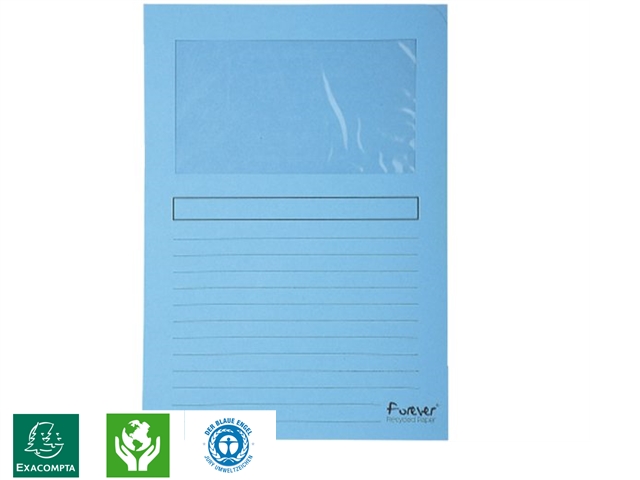 Forever L-map van 120gr gerecycled papier. Blauwe Engel gecertificeerd. Voorzijde voorzien van een transparant venster 180x100mm. De map is beschrijfbaar. A4-formaat. Afmetingen 220x310mm. Pak à 100 stuks.