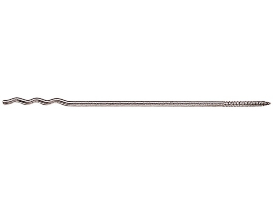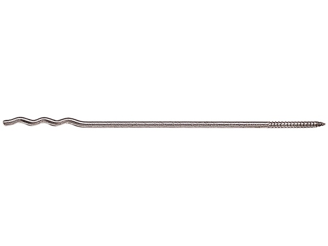 Spouwanker met houtdraad (zonder punt) ten behoeve van een UNI-perfoplug voor montage in een binnenmuur van geperforeerde keramische steen of met een kraagplug in beton, kalkzandsteen of volle baksteen en aan het uiteinde een golfprofiel dat wordt gemetseld in de voeg van de buitenmuur.