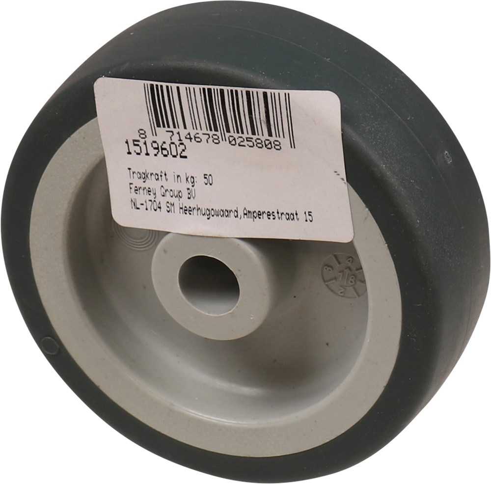 Kunststof wiel met grijs rubber loopvlak en glijlager.