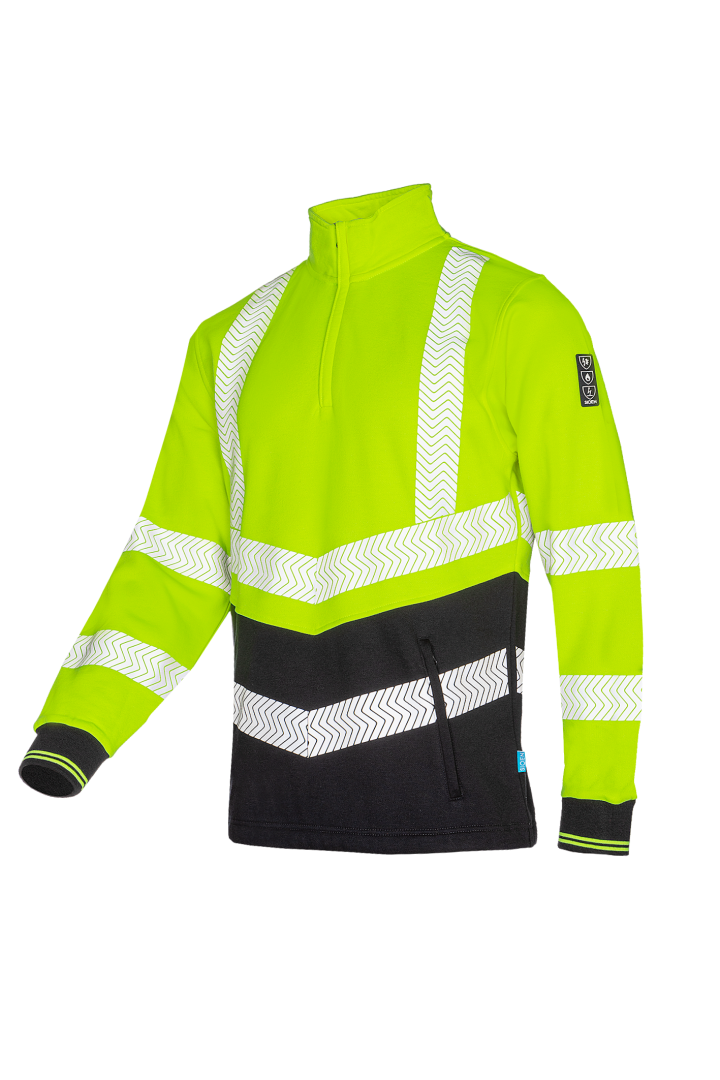 De Corran is een modieuze signalisatiesweater met gesegmenteerde reflecterende banden en ARC-bescherming. De sweater, uitgevoerd in 2 kleuren, werd uitgerust met 2 zijzakken met ritssluiting en heeft antibacteriële eigenschappen, zeer handig in gevaarlijke situaties! De sweater voldoet aan verschillende internationale normen waaronder IEC 61482-2, EN ISO 11612, EN ISO 11416 en EN 1149-5. materiaal: 55% modacryl + 43% katoen + 2% AST; ± 300 g/m² normering: IEC 61482-2 : 2018 APC1 - ATPV 14,8 cal/cm²