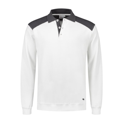 Polosweater, 50% katoen / 50% polyester, 280 gr/m², french terry met geruwde binnenzijde, regular fit met polokraag, 3-knoopsluiting, mouw met ribmanchet, tailleband in 1x1 rib en kraag, schouderstuk in contrast kleur.
