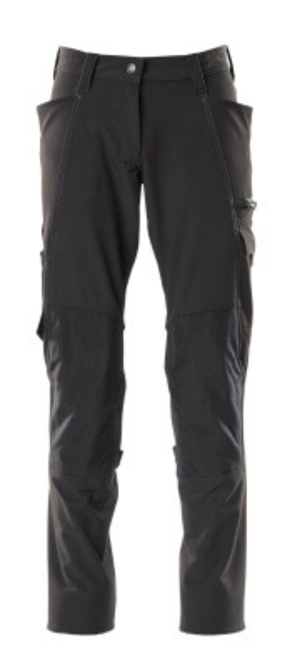 Vrouwelijke pasvorm DIAMOND. Met een waterafstotende finish. Lichte, slijtvaste strechstof, in 4 richtingen rekbaar. Door de geïntegreerde zakken is het materiaal bijna niet merkbaar op de huid. Tweevoudig gestikte naden aan de broekspijpen en in het kruis. Lage taille. Ergonomisch gevormde broekspijpen. Riemlussen. Sluiting met rits. Voorzakken. Achterzakken. Dijbeenzak met telefoonzakje en klep met verborgen drukknoop en geïntegreerde ID-kaarthouder. Afneembare ID-kaarthouder. Duimstokzak van Cordura met extra zakken. Slijtvaste ventilerende kniezakken van Cordura (500 D). De hoogte van de kniezak is gemakkelijk en individueel aan te passen. We raden de Mascot Waterloo kniestukken aan voor dit model. Met opdruk en reflectoren.