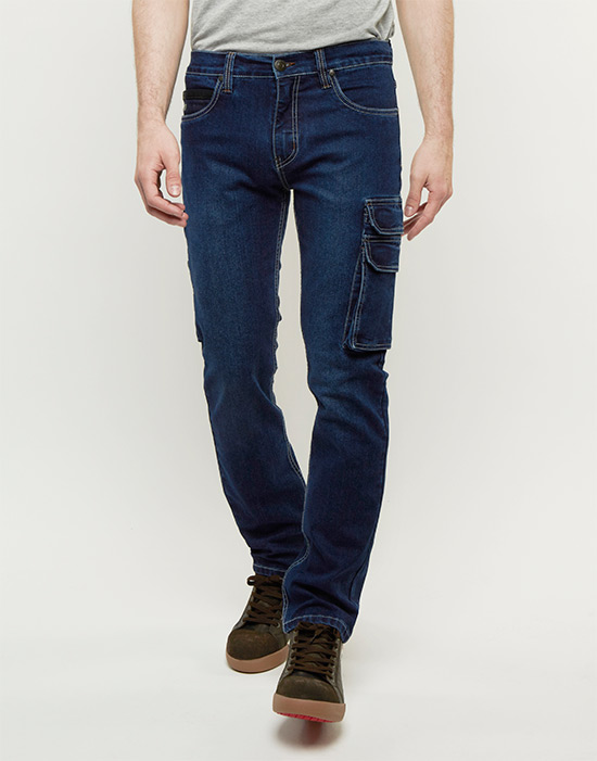 Medium blue stretch worker. Ruimvallend met dubbelzijdige zijzakken. Medium taille met rechte pijp.