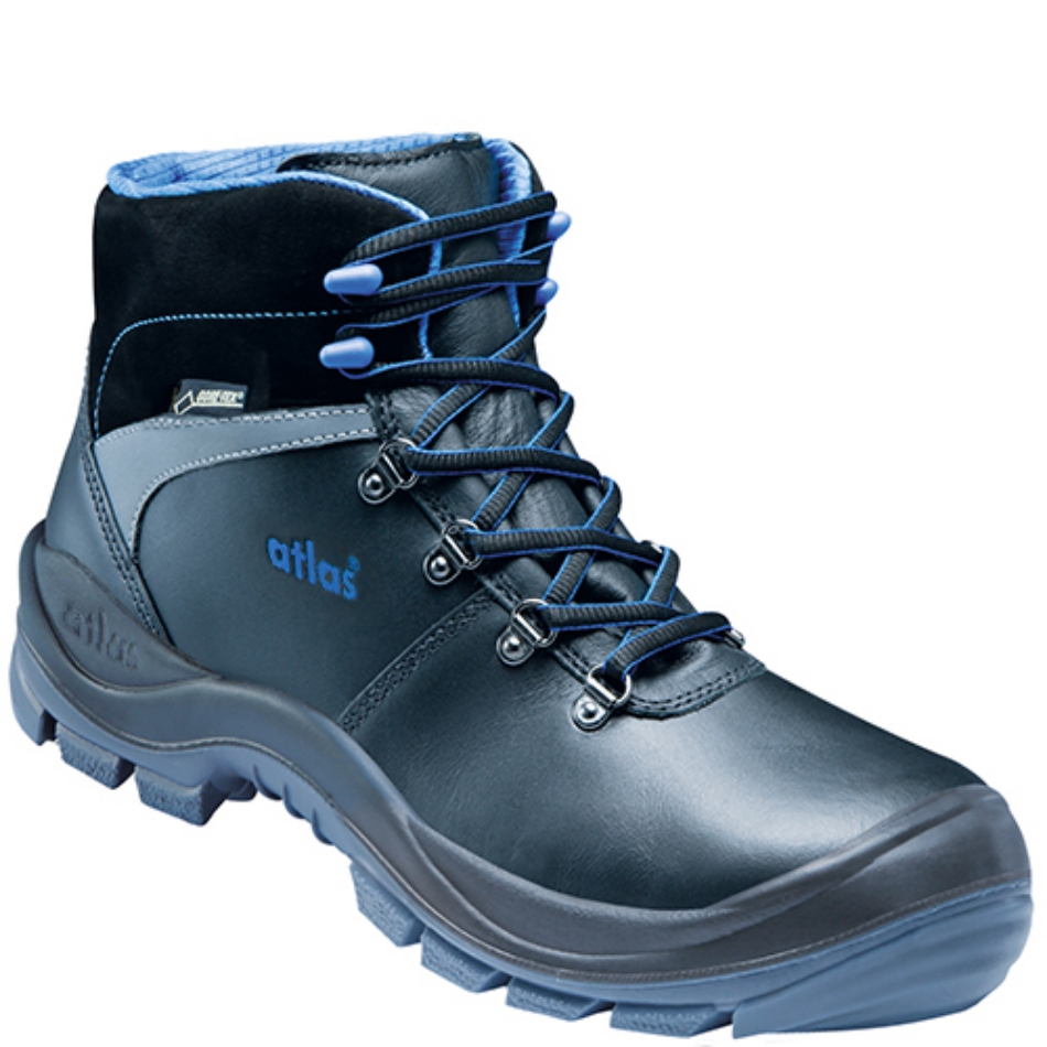 Hoog model, waterdicht, kruipneus, kunststof tussenzool, aluminium neus, Gore-Tex binnenvoering, Klima Komfort inlegzool neemt transpiratievocht op, PU-zool, grof noppenprofiel. Leverbaar in de kleur(en): zwart-rood-blauw Leverbaar in de maten: 36 - 49