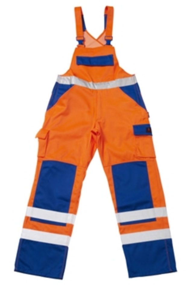 Fluorescerend, met reflecties. Teflon maakt het product vuilafstotend. Tweekleurig. Drievoudig gestikte naden aan de broekspijpen en in het kruis. Verstelbare schouderbanden met korte sterke elastieken en kunststof gespen. Borstzak met klep en drukknopen. Binnenzak met klittenbandsluiting. Verstelbare tailleband. Voorzakken. Gulp met rits. Achterzak met versterkingen - waarvan één met klep en klittenbandsluiting. Verstelbare hamerlus. Steekzak met vakverdeling, klep en verstelbare klittenbandsluiting. Pennenzakjes. Telefoonzak op de dijbeen met klep en verstelbare klittenbandsluiting. Duimstokzak. Kniezakken.